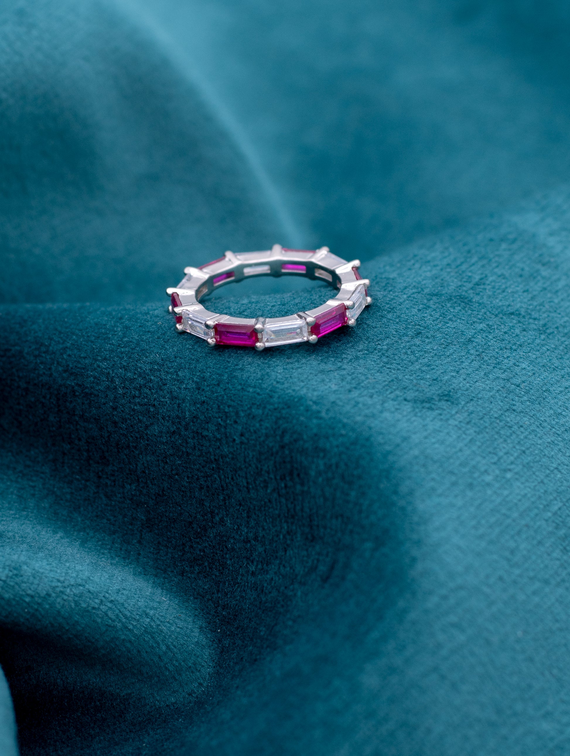 Raspberry Radiance Ring Band is a beautiful ring with high-quality zircon on the outdoor coverage giving a classy and princess look to the silver band a fully emblished band is a unique piece of fine jewelry.